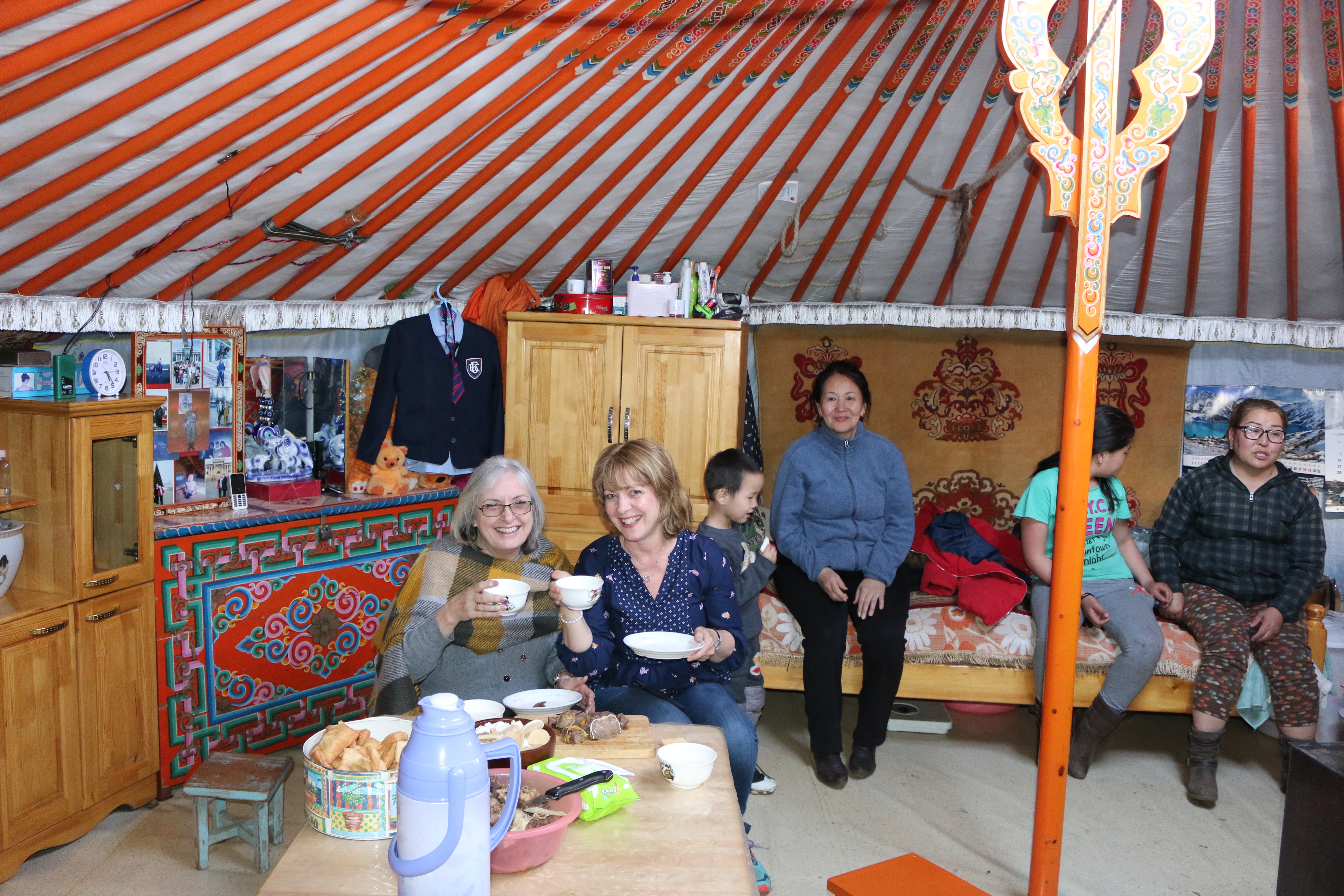 We also had the privilege of visiting two different families in two different kinds of homes. One was in a town apartment and the other in a traditional round tent called a ger. The latter was owned by a herding family who lived out on the steppe. We drove across miles of bumpy grassland stretching out as far as the eye could see. To our western eyes who are used to roads and maps, we couldn’t see how this family could be found. But Tseggi reassured us that they were in touch with the family by mobile phone and that they were guiding us that way!